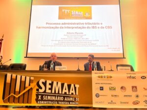 O X Seminário AIAMU de Administração Tributária Municipal (SEMAAT) recebeu, no Centro de Eventos da AIAMU, em Porto Alegre, o auditor fiscal tributário do Município de São Paulo, Alberto Macedo, que apresentou a palestra “Processo administrativo tributário e harmonização da interpretação do IBS e da CBS”. A mesa foi coordenada por Salomão Alberto Leizer, diretor da INFISC.