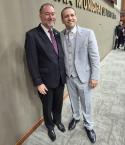 O presidente da Associação dos Auditores Fiscais da Receita Municipal de Porto Alegre (AIAMU) participou, na manhã desta segunda-feira (5/1), da Sessão Especial que marcou a transmissão da presidência da Câmara Municipal de Porto Alegre. Na ocasião, o vereador Moisés Barboza (PSDB) assumiu o comando do Legislativo da Capital para o ano de 2026, sucedendo a vereadora Comandante Nádia (PL), que presidiu a Casa em 2025.